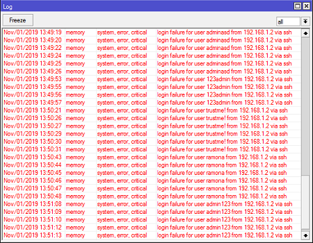 Dari sisi user tentunya log informasi tersebut akan sangat mengganggu karena log akan mencatat semua aktifitas yang terjadi pada router, termasuk client yang mencoba login ke Router. Kemudian dari sisi Router tentunya juga akan membebani resource dari Router ketika terdapat banyak client yang hendak mengakses Router (Bruteforce).